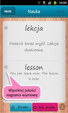 Program kilka opcję z nauką słówek (oglądamy wyrażenie w języku polskim i na głos mówimy jego tłumaczenie. Zaznaczamy "Tłumacz" i patrzymy, czy mamy rację. Lektor czyta nam na głos słowo z wymową, a my patrzymy, czy dany zwrot znaliśmy. Jeśli tak, wciskamy odpowiedni guzik, jeśli nie - robimy to samo. Słówka, których nie znamy, przechodzą do bazy. Zwrotom towarzyszą przykłady użycia w zdaniu. Ponadto można powrócić do wymowy przyciskając na ekranie słówko (ze zdaniem jest to samo). Proste :) A oprócz nauki jest opcja powtórki. Ciekawostkę stanowi funkcja "Postępy nauki". Widzimy ilu słówek z całej bazy się uczymy, ile zapamiętaliśmy. Niżej są pokazane przegródki (takie, jak w pudełku do fiszek). W miarę robienia postępów wirtualne kartoniki wędrują o jeden stopień wyżej (czyli nie musimy się bawić w przekładanie). Kolejna funkcja to "Menadżer słówek", czyli cały słowniczek, pełna informacja o tym, ile razy powtarzaliśmy dane słowo, kiedy ostatni raz z nim pracowaliśmy, w której wylądowało przegródce. Jest tłumaczenie, a także ikonka do sprawdzenia wymowy. Można dodać też własną bazę (przydatne np. przed egzaminem). Lista własnych słówek jest automatycznie dodawana do głównej bazy. Ostatnia funkcja to test, czyli pokazane słów w j. angielskim i 4 propozycje tłumaczenia.